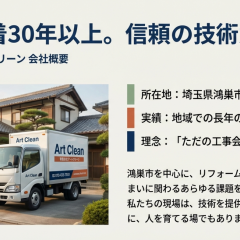 **有限会社アートクリーン**は、地域密着30年以上の実績を持ち、水回り修理・住宅リフォーム・外壁塗装・電気工事・小修繕・清掃まで一社完結で対応している会社です。